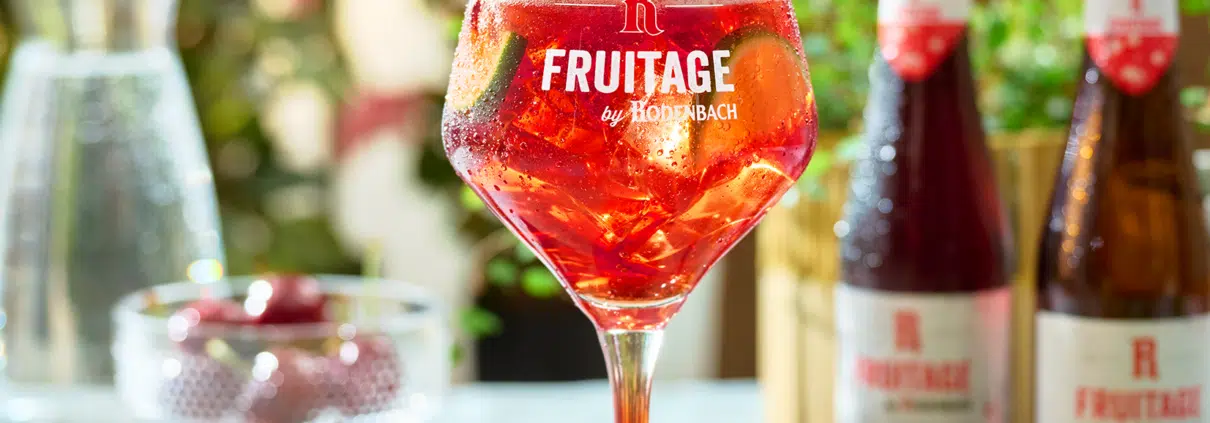 Een variant hierop, kun je zeggen, is Fruitage by Rodenbach. Hier is de basis niet lambic, maar het foederbier waarmee Rodenbach Classic en bijvoorbeeld Rodenbach Grand Cru wordt gemengd. Dit frisse fruitbier, gebrouwen met 100% natuurlijke ingrediënten en zónder kunstmatige toevoegingen, maar mét puur vruchtensap, kun je schenken in een aperitiefglas en serveren met ijsblokjes, een schijfje limoen en een blaadje munt. Een zomerse biercocktail, zo ziet het eruit! Ook kun je de alcoholvrije versie nemen: Fruitage by Rodenbach 0.0